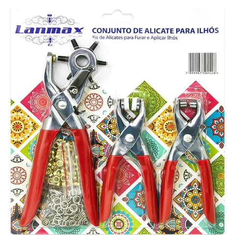 O Kit 3 Alicates Vazador, Furador e Pregar Botão Tic Tac 35 Ilhós - Lanmax é um conjunto versátil para artesanato, costura e trabalhos manuais. Inclui um alicate furador, um alicate para pregar botões de metal Tic Tac e um alicate para aplicar ilhós. Ideal para uso em couro, tecido, papel, cartolina e outros materiais, tornando seus projetos mais práticos e eficientes.